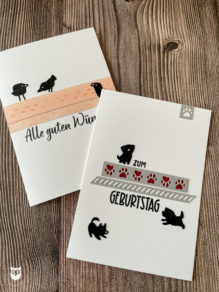 Deine Tiere müssen nicht schwarz sein, Du kannst sie in der Farbe Deiner Wahl ausstanzen und natürlich auch mehrfarbig machen. Ein, zwei Stampin‘ Blends oder andere Stifte Deiner Wahl und schon sieht der gestanzte Schnuffi aus wie Dein Hündchen, Deine Katze (auch drei im Set) oder Dein Vogel.
