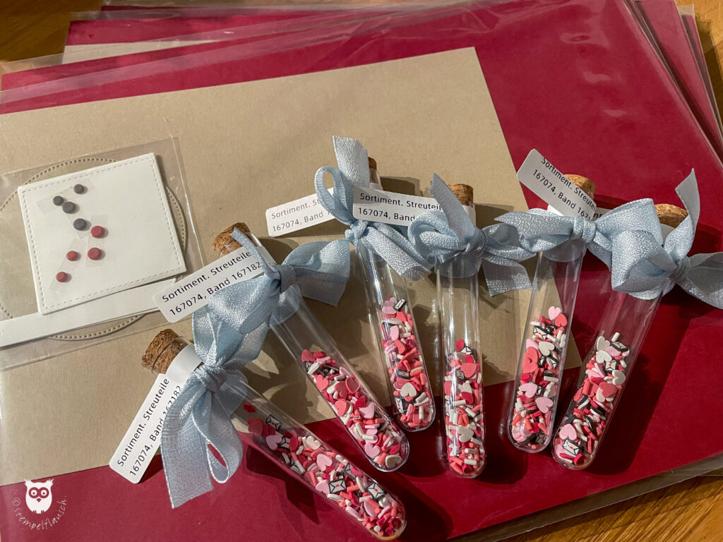 In den Materialpaketen von diesem Monat steckte eine kleine Überraschung und Vorschau auf das kommende Sortiment. Das Band in Wolkenmeer ist traumhaft schön und macht meine Reagenzgläser mit herzigen Streuteilen noch romantischer.