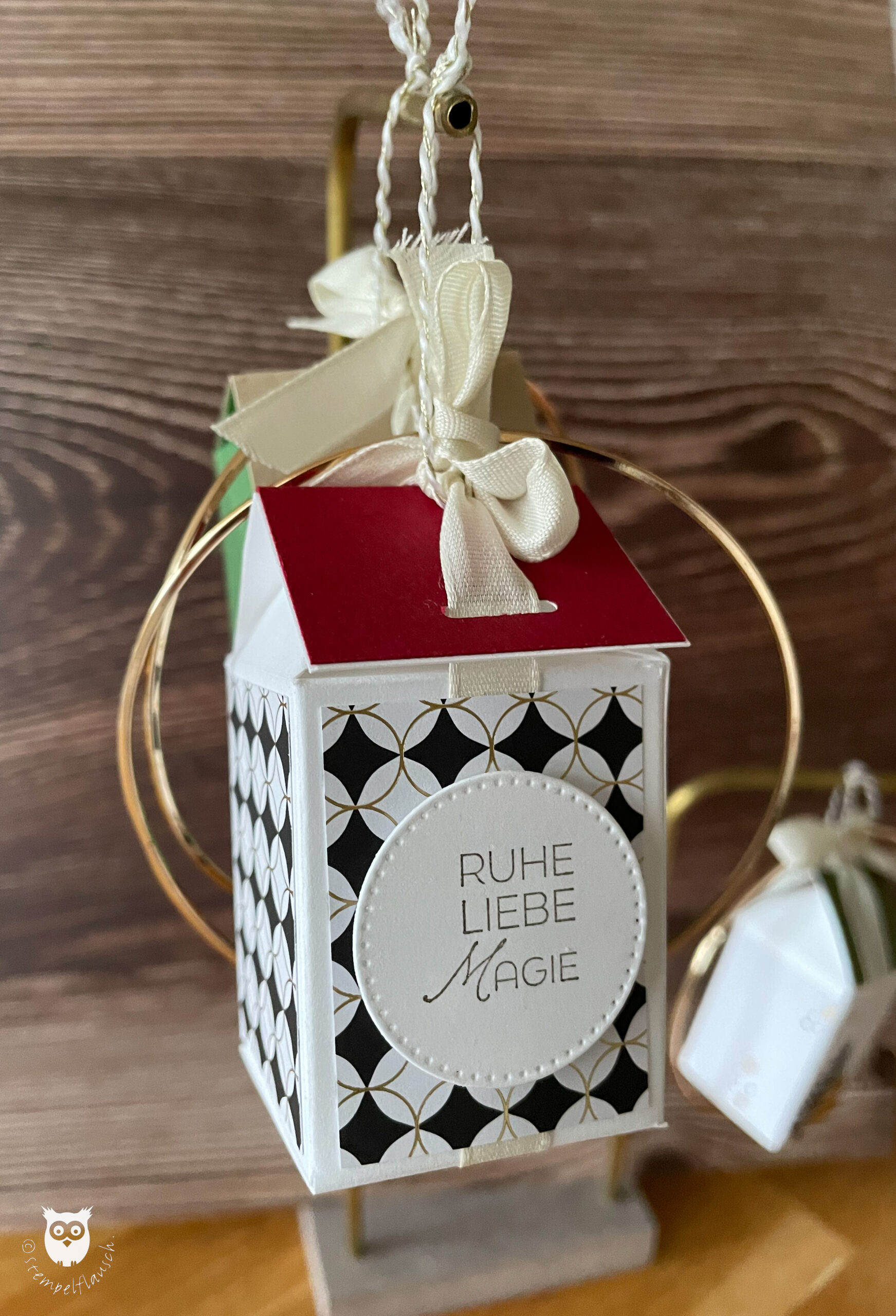 Diese kleinen Häuserboxen sind eine Mini-Version meines diesjährigen Adventskalenderbeitrages für den Tausch und passen in unsere Ringe hinein. Sie lassen sich aklso nicht nur an den Baum hängen, sondern auch mit kleinen Überraschungen befüllen. Meine Festtagsclubgäste hatten die Anleitung dafür im Dezember-Paket.