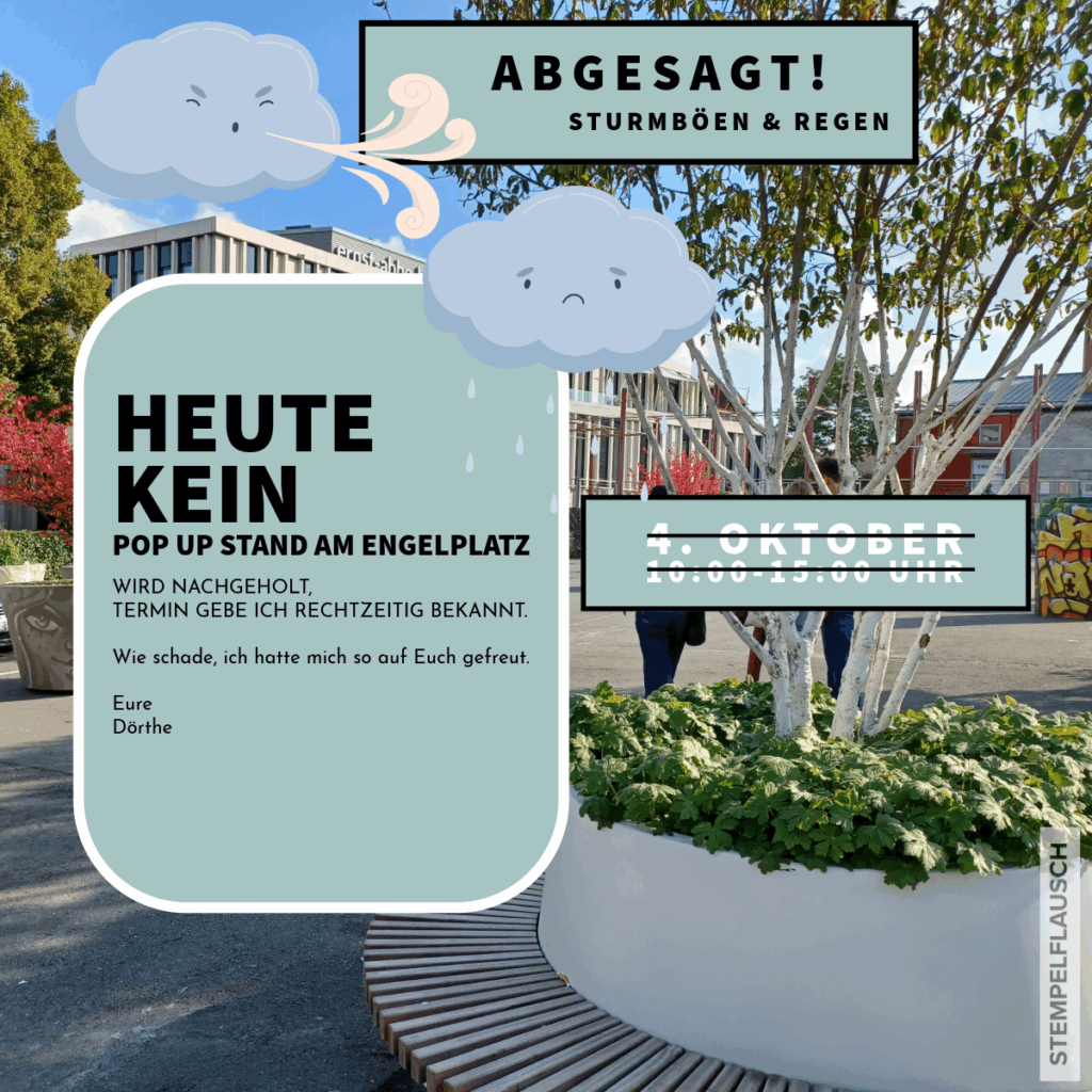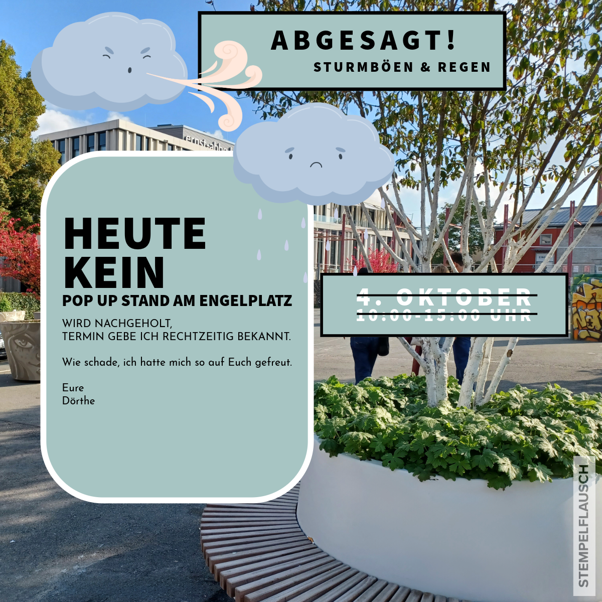 Mit viel Liebe hatte ich kleine Pflanztöpfe für die Stehtische dekoriert, damit alles schön aussieht. Zwei wetterfeste neue Stehtische mit Husse hatten wir Freitagnachmittag zusammen mit der gesamten Stand-Ausstattung ins Auto gepackt, nur um gestern früh alles wieder auszupacken. Regen und Sturmböen wechselten sich ab, Aufbauen hatte keinen Zweck.