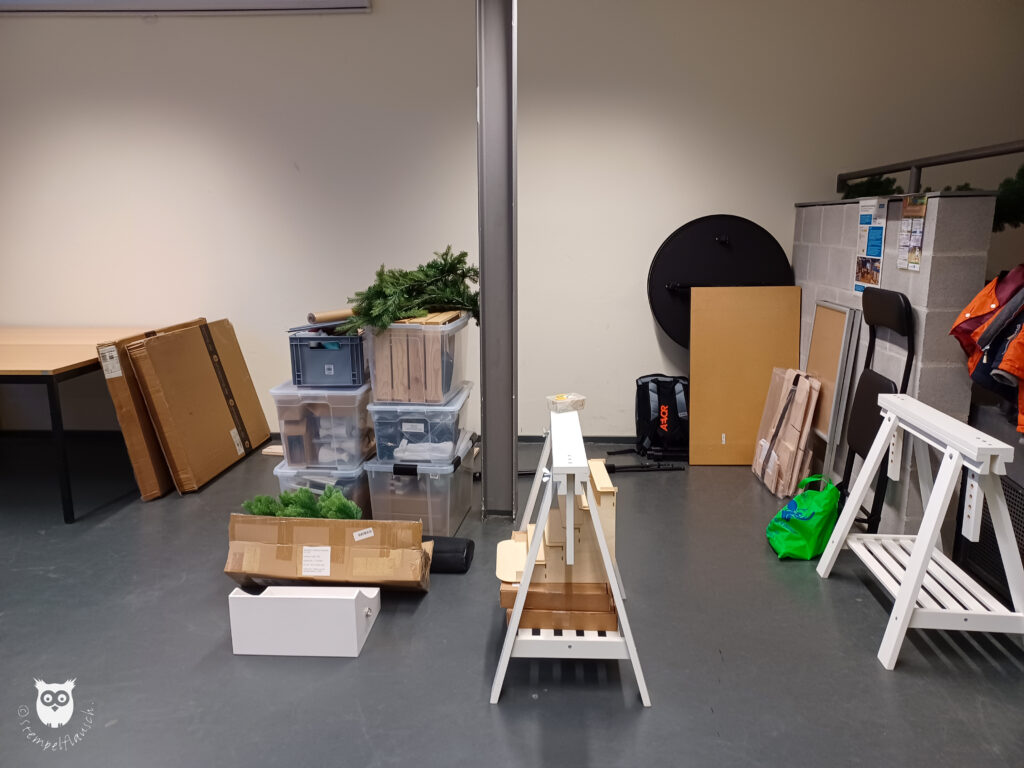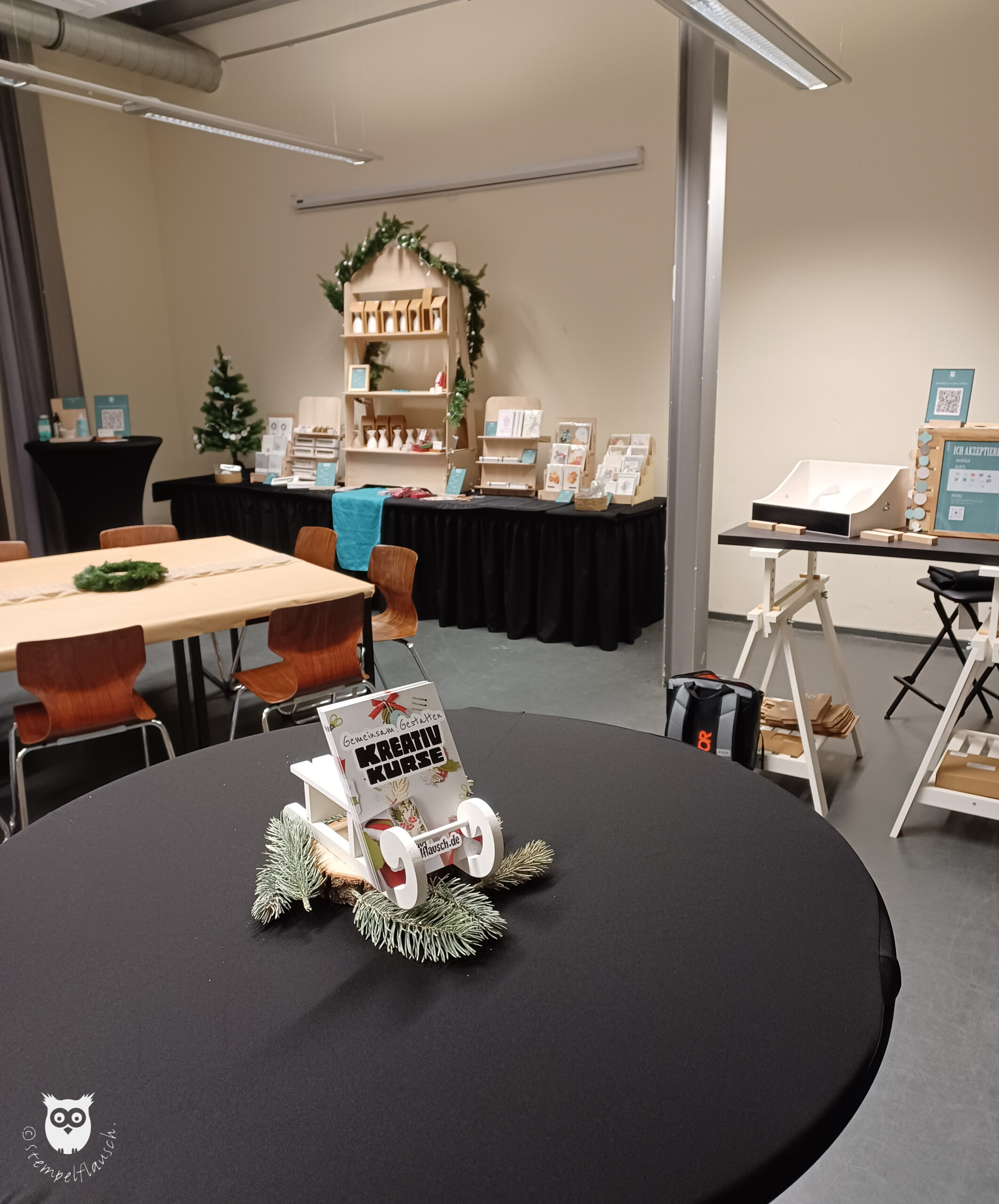 Nach zwei Stunden Arbeit wirkt das Ganze dann schon viel gemütlicher. Neben einem Verkaufsbereich haben wir den Mitmachbereich ausgestattet, die Make & Take Station mit dem Kassenbereich eingerichtet und außerdem noch zwei Stehtische aufgestellt.