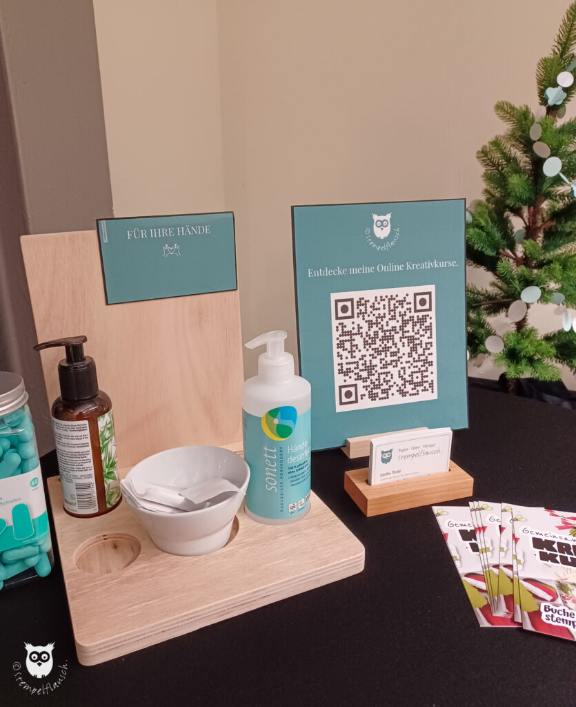 An dem zweiten Stehtisch steht diesmal eine „Pflegestation“ für meine Gäste bereit. Desinfektionsmittel, Pflegecreme, Pflaster für alle Fälle und sogar Ohrstöpsel für diejenigen, denen es zu turbulent zugeht. Das gab es noch nie bei mir.