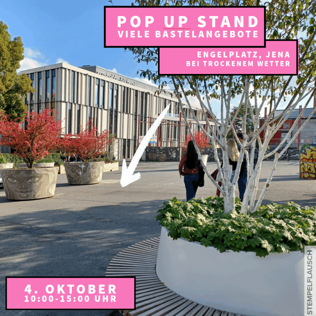 Fall Du ab morgen keinen Urlaub hast oder Deine Zeit nicht für die Fahrt zur Hobbymesse reicht, dann komm doch am Samstag – 4. Oktober – zu meinem Pop Up Stand auf dem Engelplatz nach Jena. Es ist Weltkartenbasteltag und ich werde viele Make & Take Tüten im Gepäck haben.