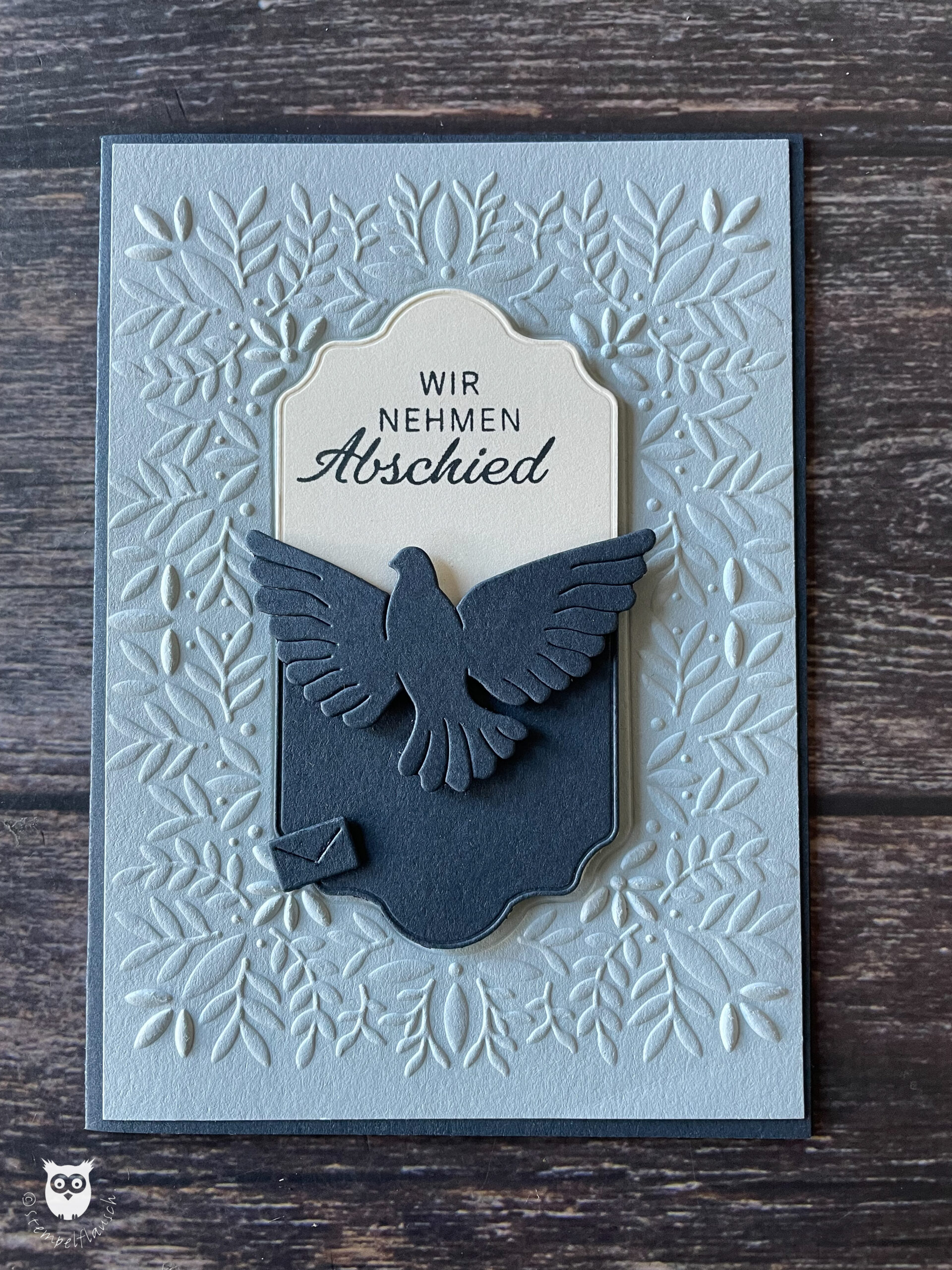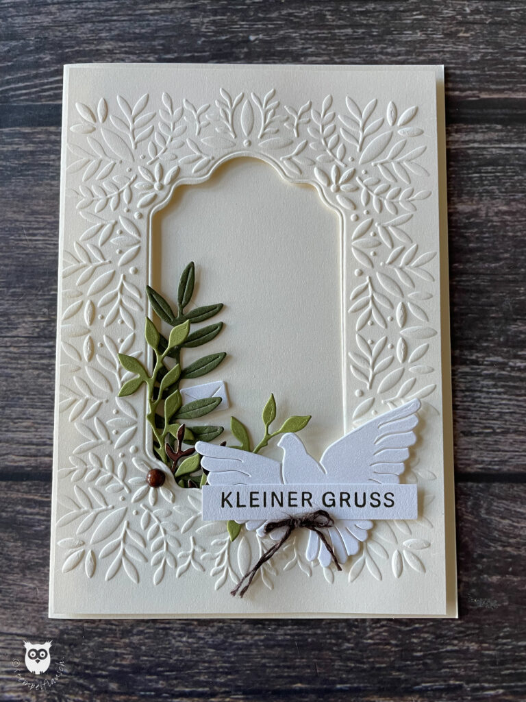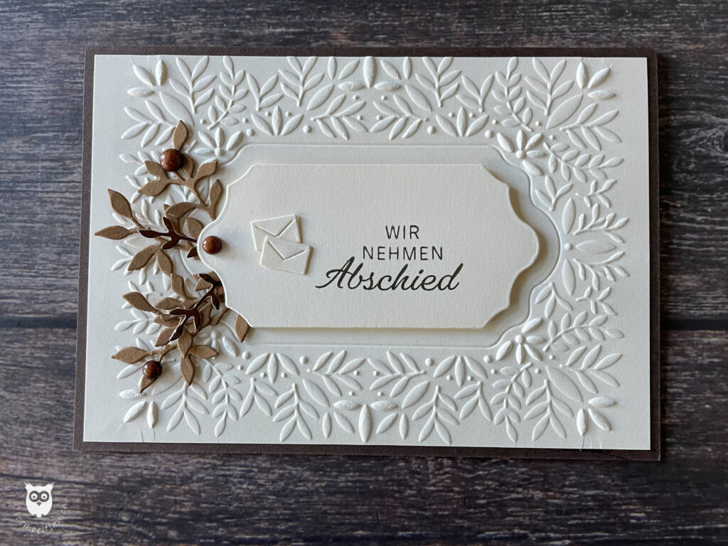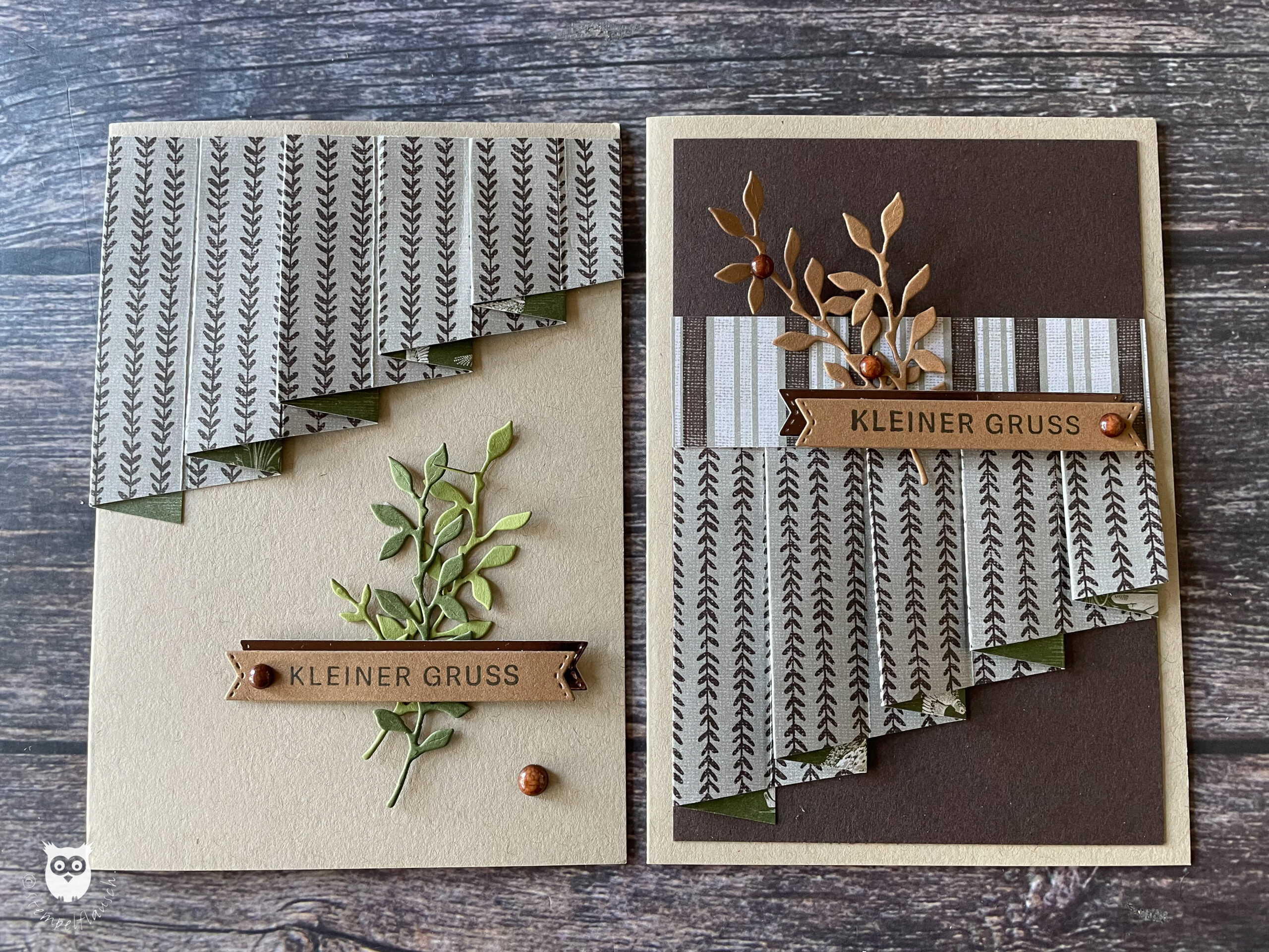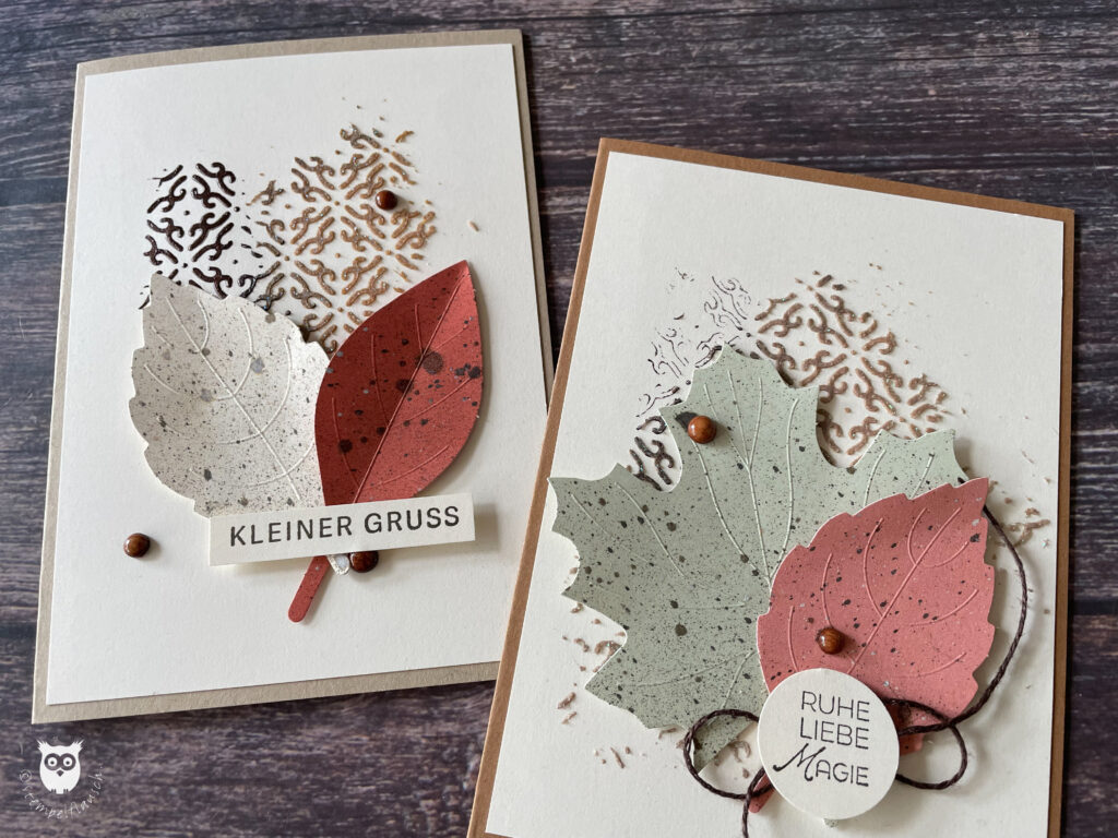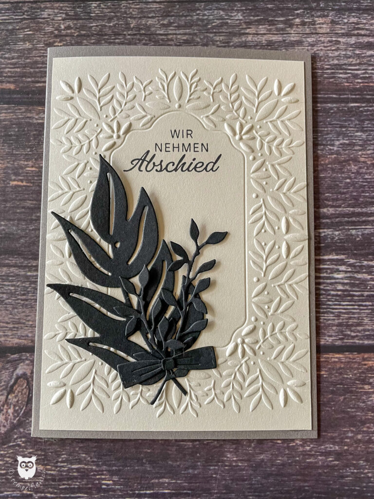 Für diese beiden Karten Stanzformen (links große Blätter und Schleife) sowie Stempel (rechts Blüten und Zweige) aus dem kommende Monat zum Einsatz. Die Grundkarten sind in Kieselgrau (Farbton nicht mehr erhältlich), die Aufleger beide in Basic Beige. Wie eine Prägung doch den Wahrnehmung verändern kann.