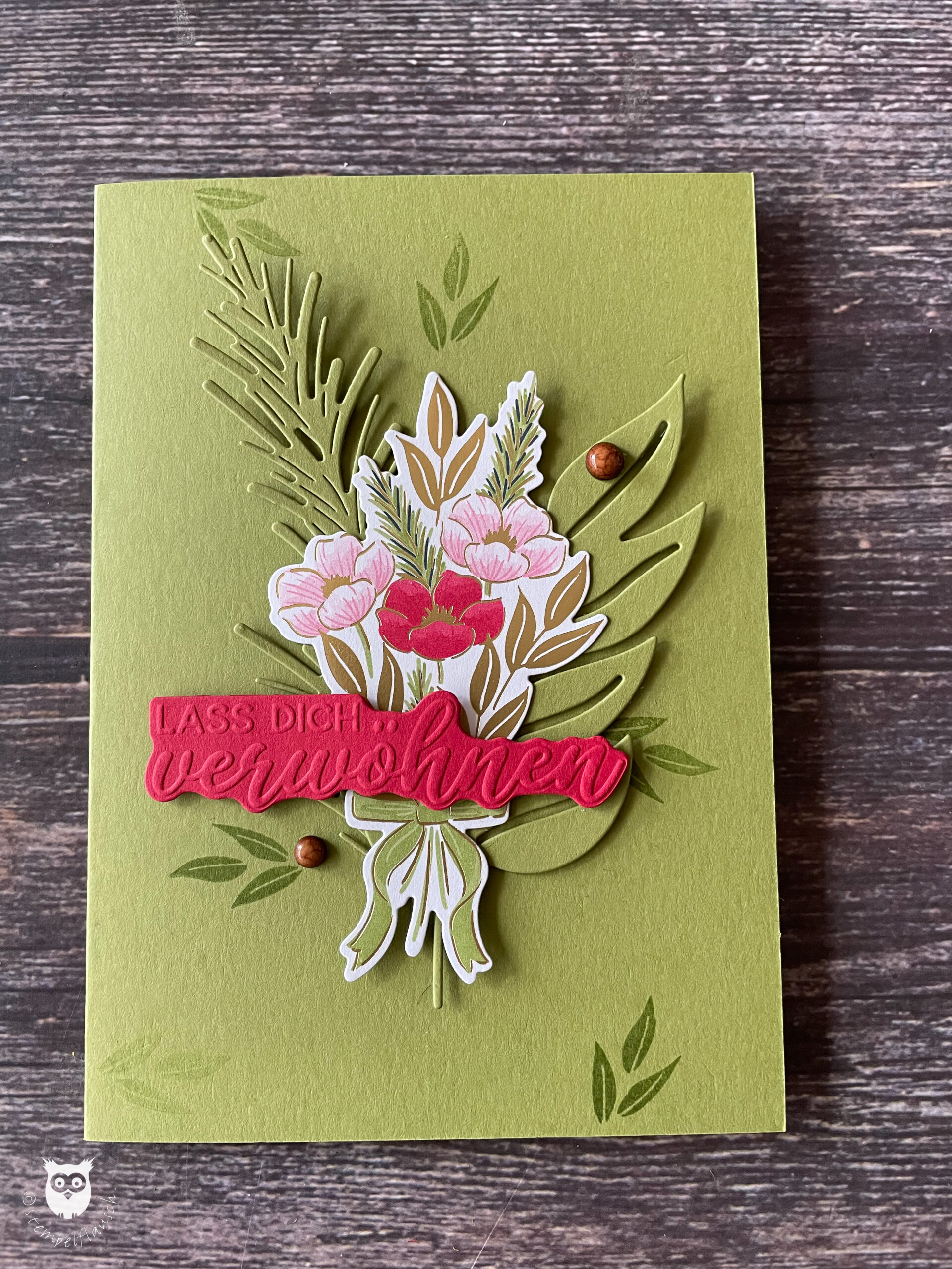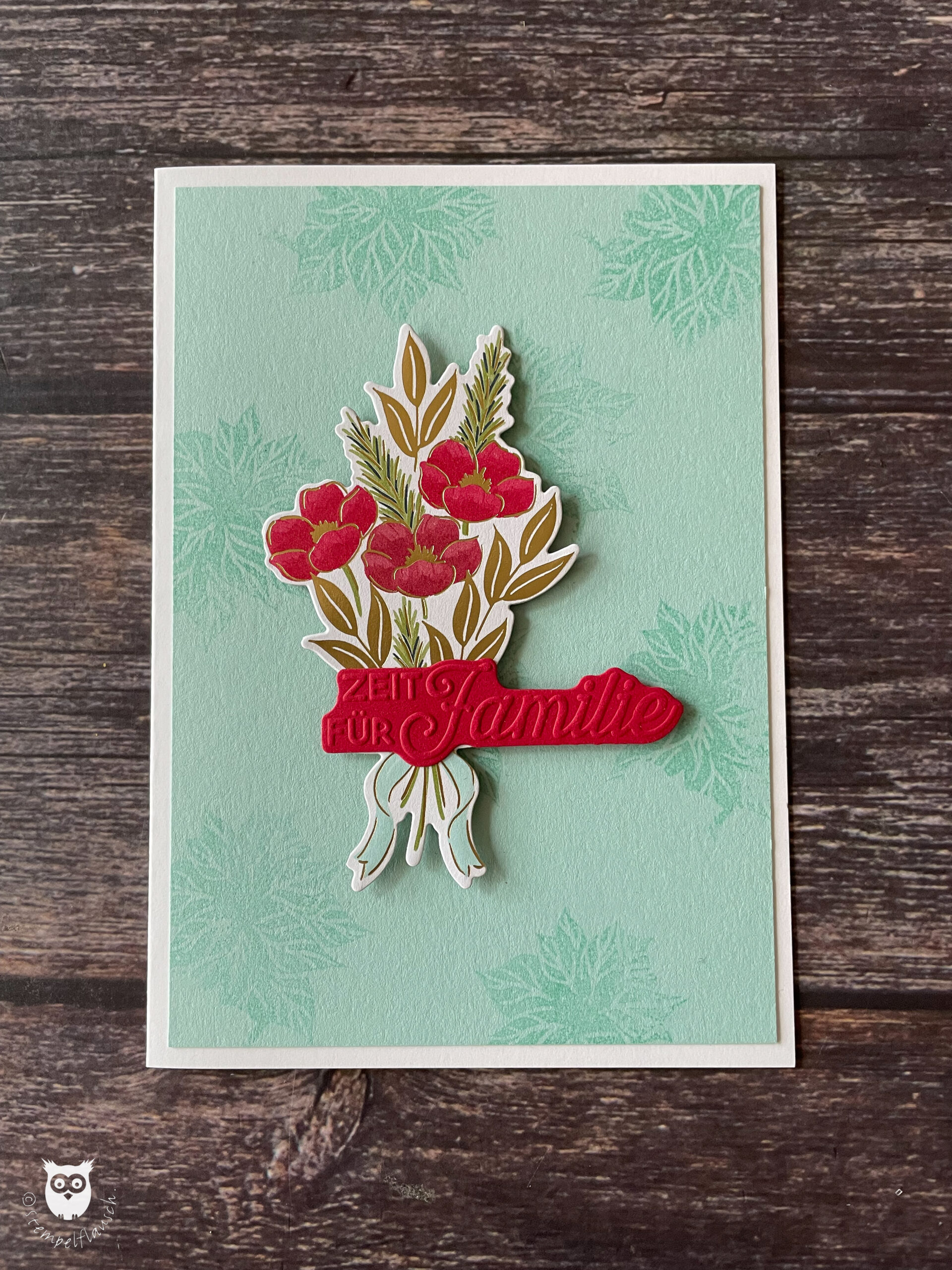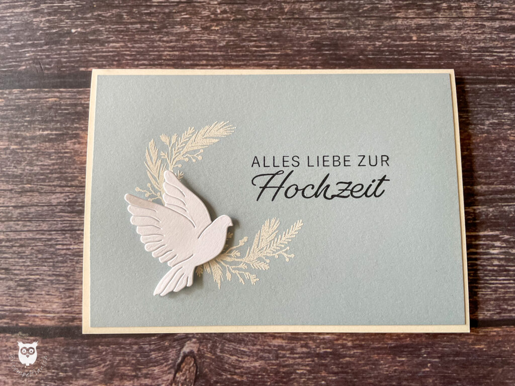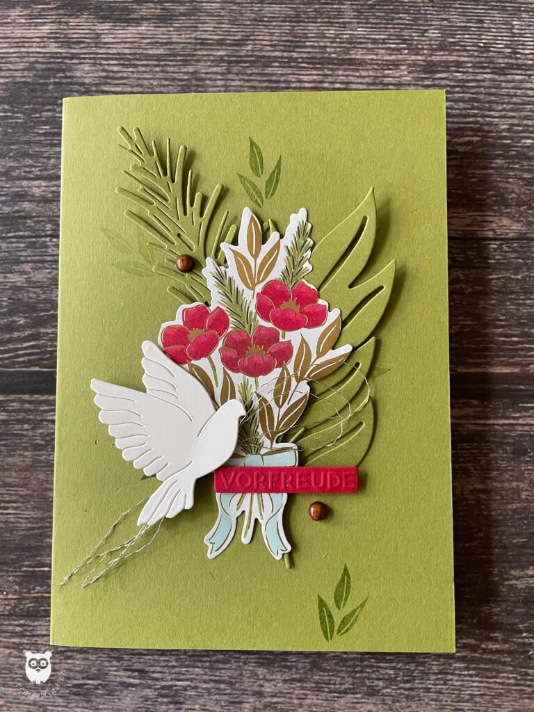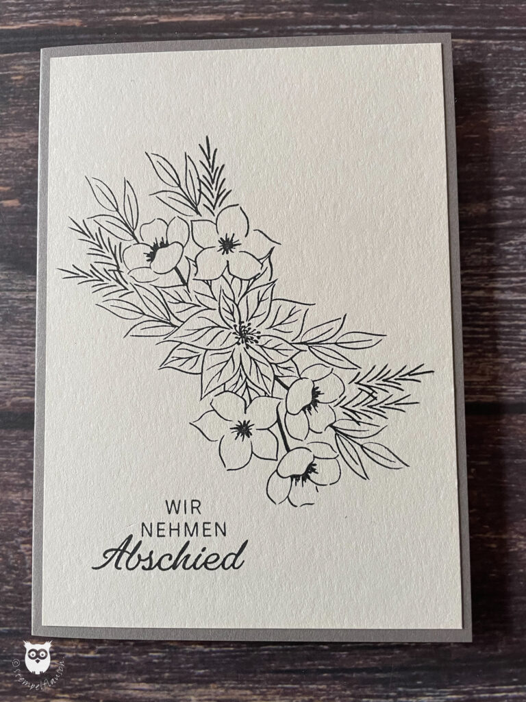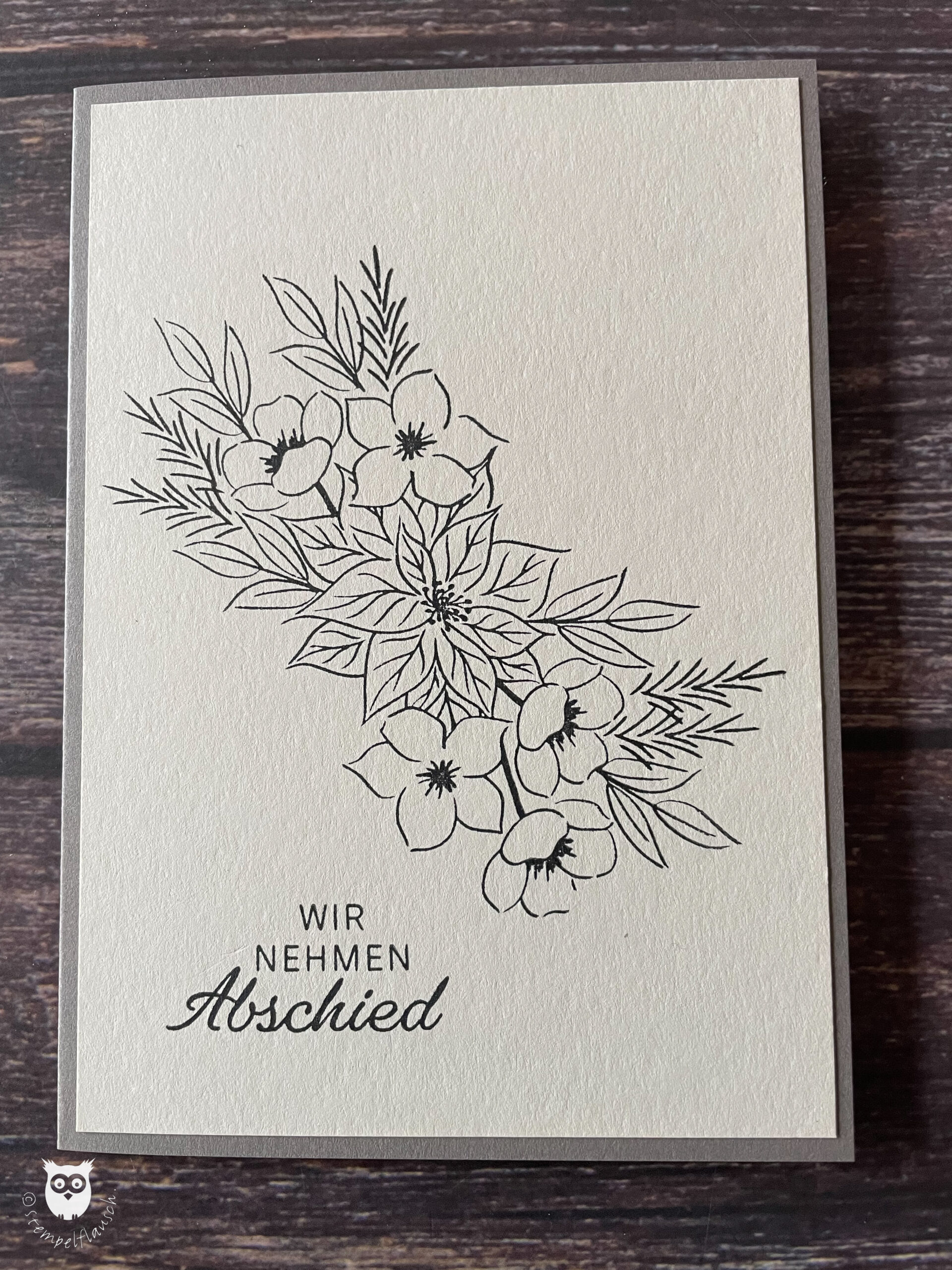 Für diese beiden Karten Stanzformen (links große Blätter und Schleife) sowie Stempel (rechts Blüten und Zweige) aus dem kommende Monat zum Einsatz. Die Grundkarten sind in Kieselgrau (Farbton nicht mehr erhältlich), die Aufleger beide in Basic Beige. Wie eine Prägung doch den Wahrnehmung verändern kann.