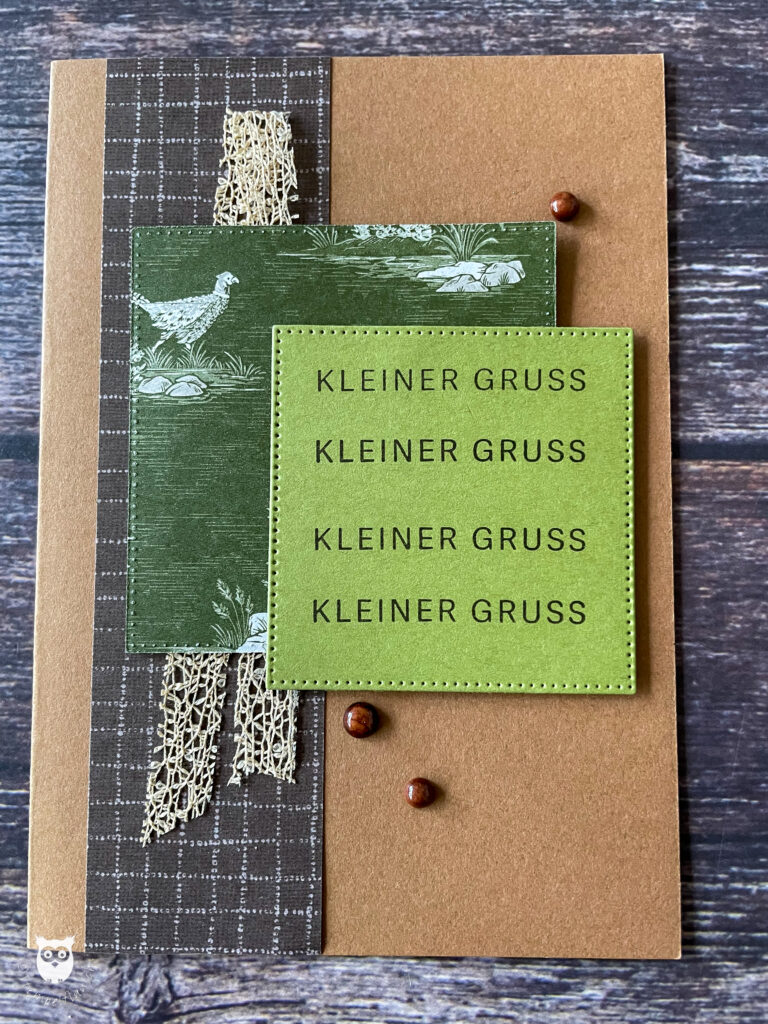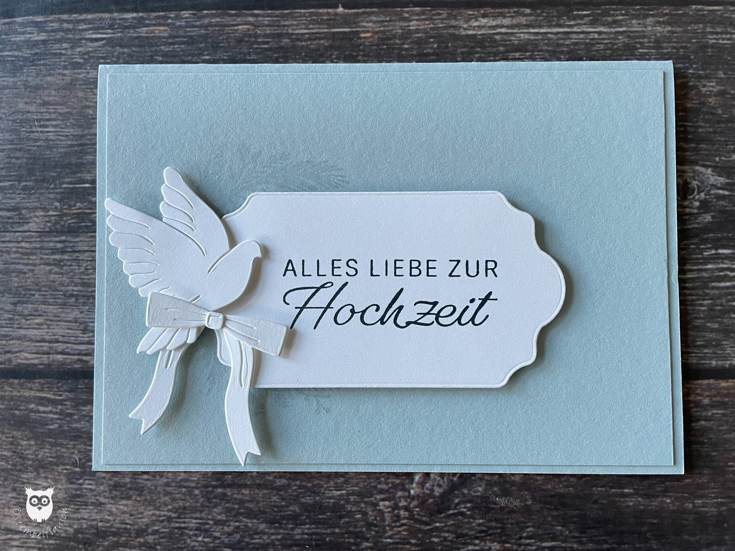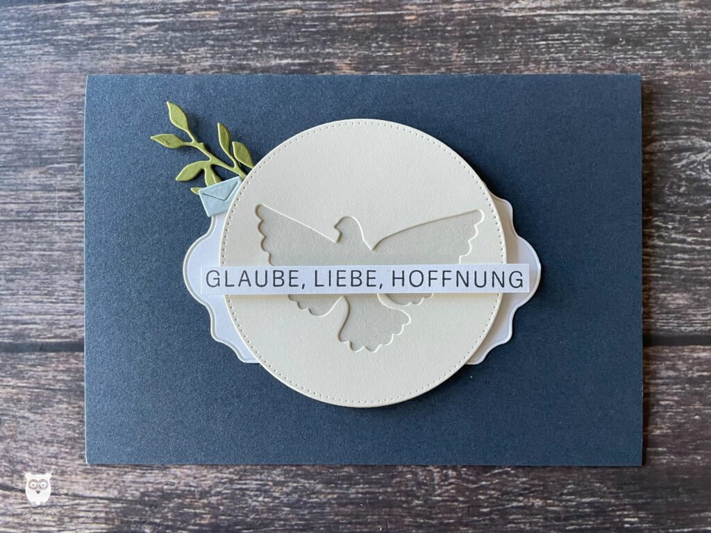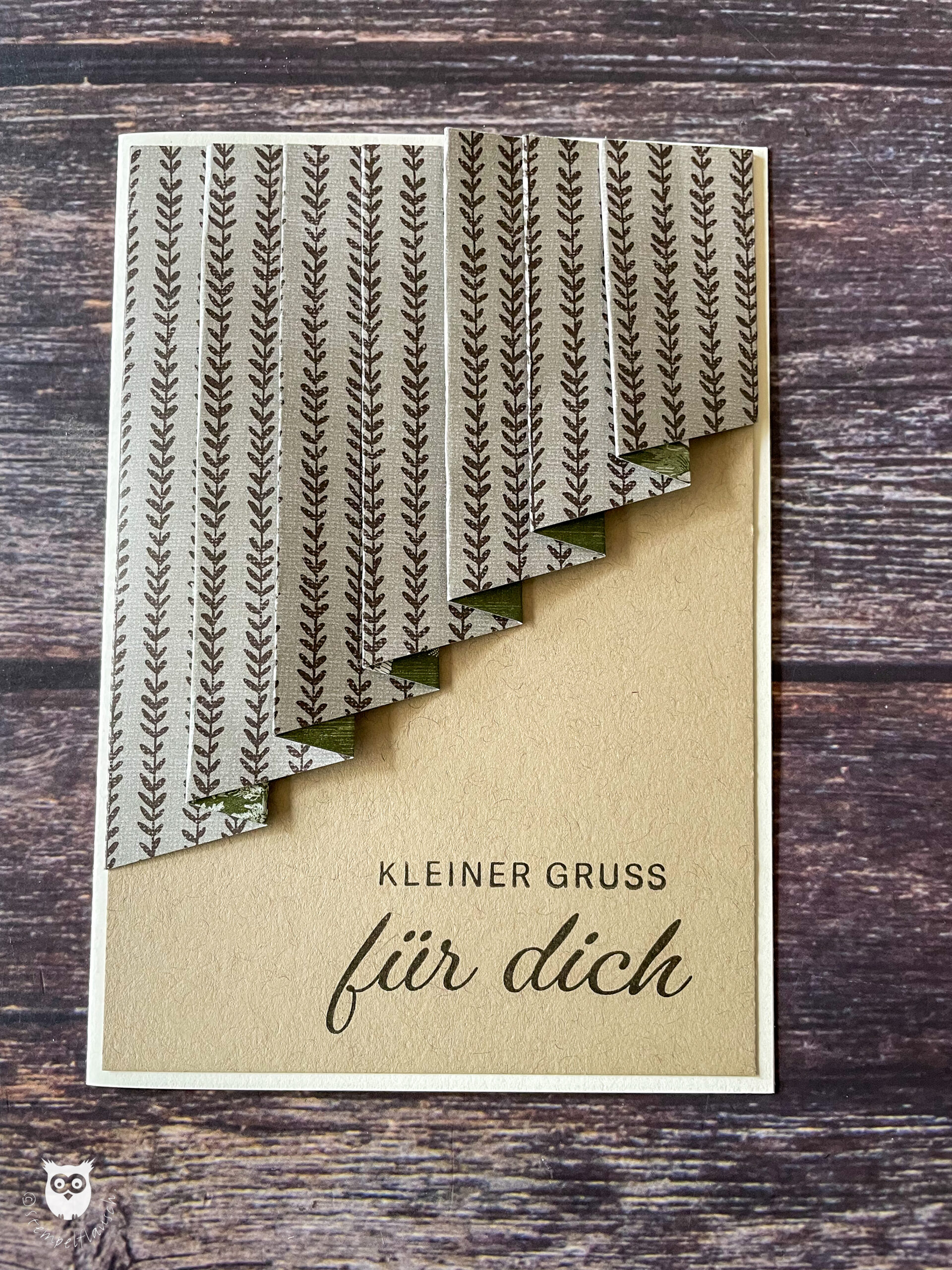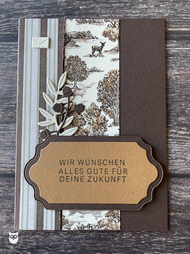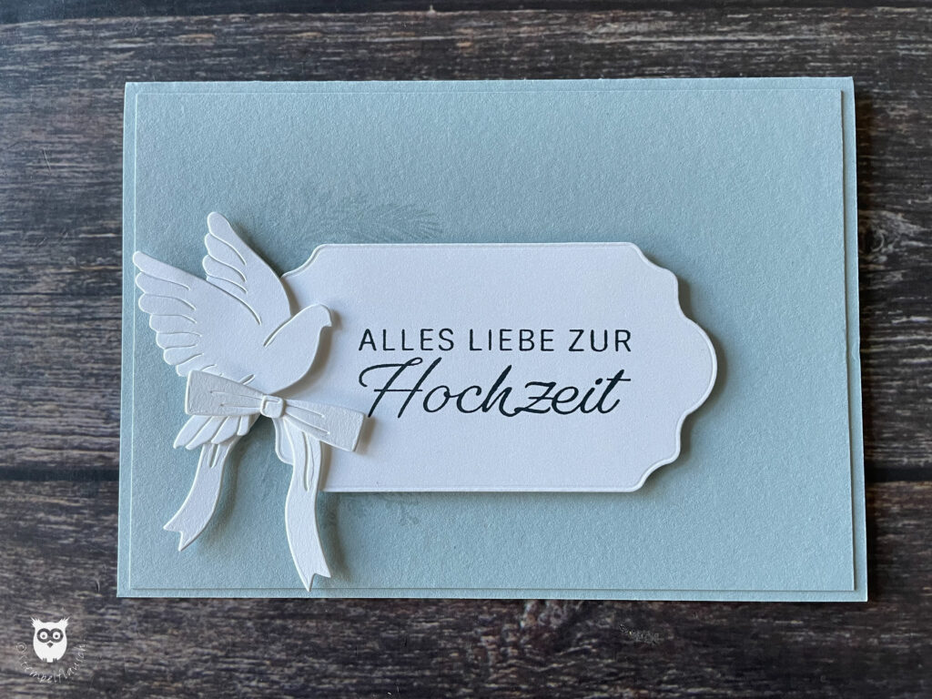 Für diese beiden Karten Stanzformen (links große Blätter und Schleife) sowie Stempel (rechts Blüten und Zweige) aus dem kommende Monat zum Einsatz. Die Grundkarten sind in Kieselgrau (Farbton nicht mehr erhältlich), die Aufleger beide in Basic Beige. Wie eine Prägung doch den Wahrnehmung verändern kann.