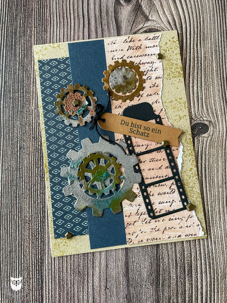 Was für ein herrliches Farbspektakel die Zahnräder aus „Gears & Textures“ doch mit sich gebracht haben. Nicht beim Ausstanzen, wohl aber später beim Embossen. Danach musste ich meine Finger schrubben, aber es hat sich gelohnt.