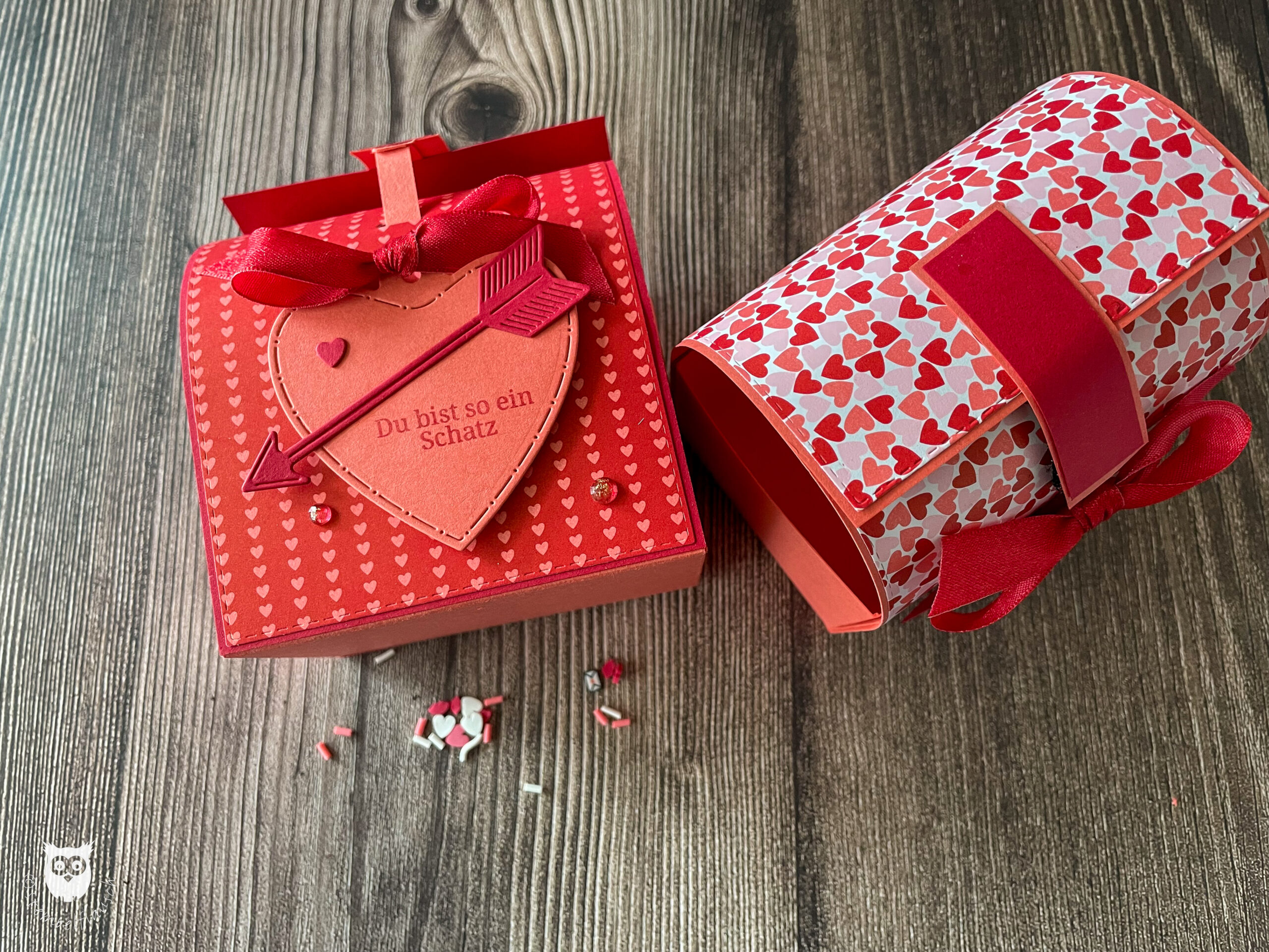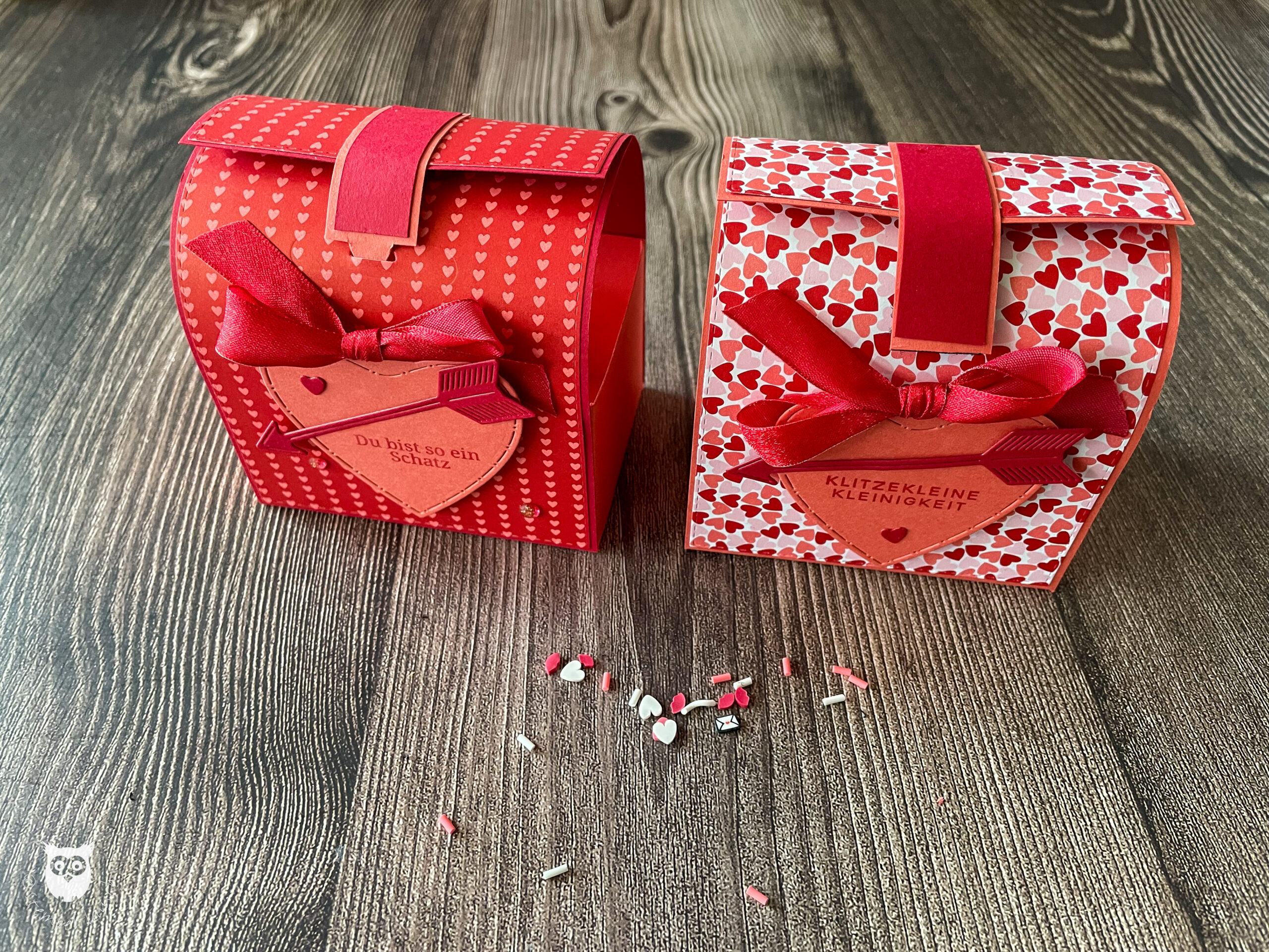 Rechtzeitig vor dem Valentinstag ist am Wochenende außer der Reihe mein Anleitungsvideo für diese schnuckeligen Verpackungen auf meinem YouTube-Kanal erschienen. Vielleicht hast Du das Video schon entdeckt entdeckt und Deine eigene Box schon gebastelt.