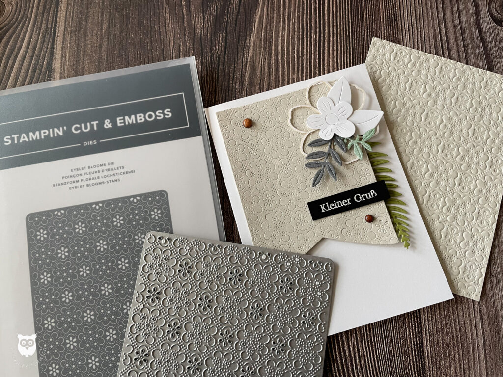 Mit dem Produkt des Monats vom April konnte ich bereits experimentieren. Ich finde die Stanzform „Florale Lochstickerei“ so richtig toll. Hier siehst Du mal ein Beispiel.